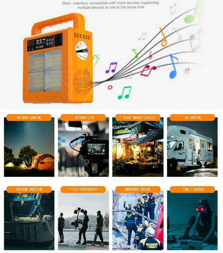 This product is suitable for various devices, including strong flashlights, high brightness side lights, Bluetooth audio, 5V/12V/220V output, multiple interfaces, compatibility with more devices, and support for multiple devices to use simultaneously.
